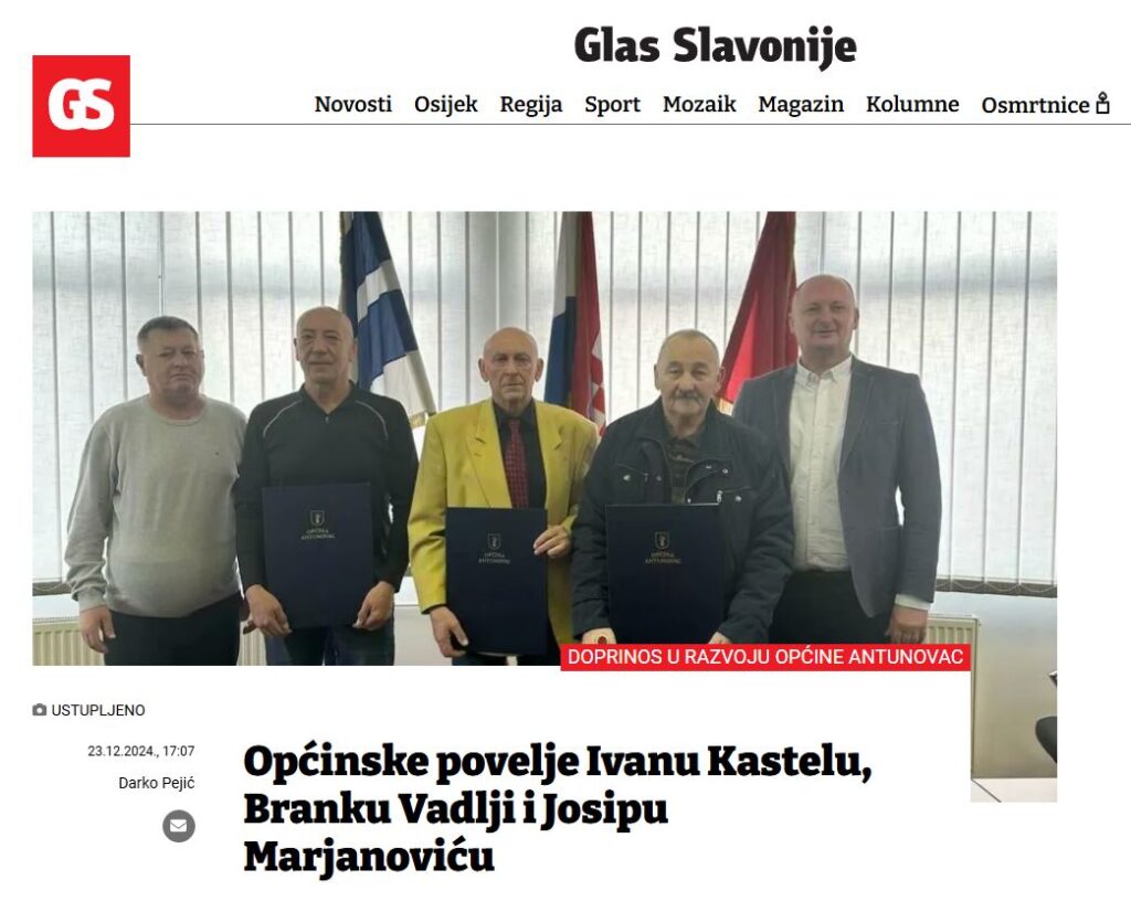 GLAS SLAVONIJE – OPĆINSKE POVELJE IVANU KASTELU I BRANKU VADLJI ZA DOPRINOSE U RAZVOJU OPĆINE ANTUNOVAC